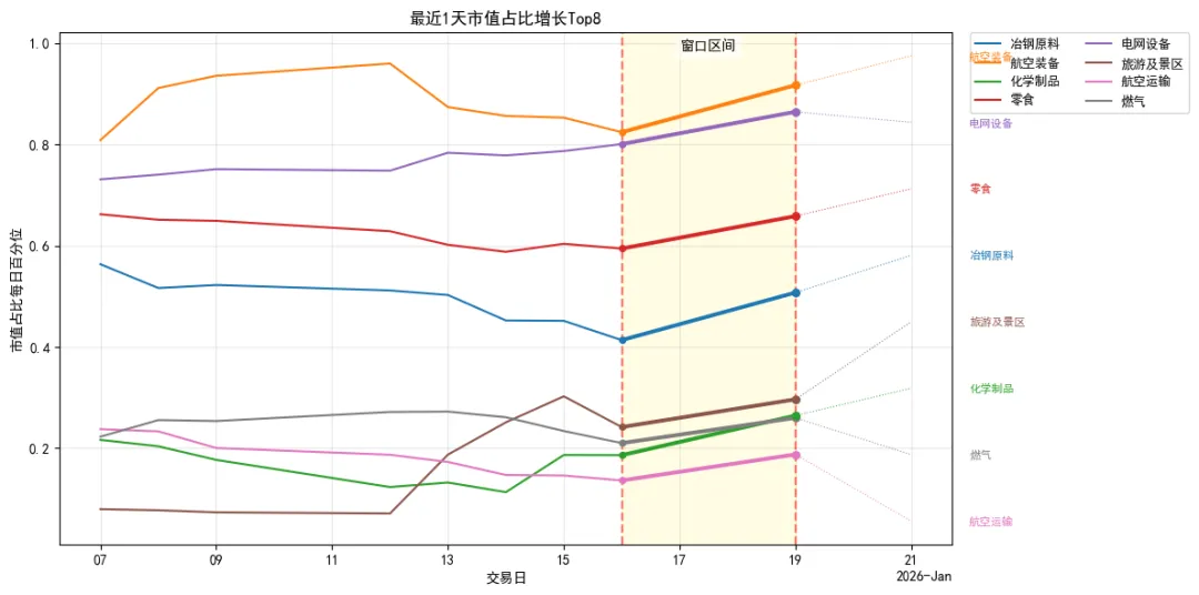 冶钢原料、航空装备、化学制品、零食、电网设备、旅游及景区、航空运输、燃气