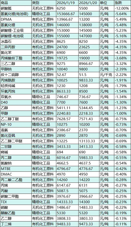 下跌压力集中于锂系核心品种、部分有机化工品及小众无机化工品,核心源于短期情绪性抛售、供需宽松或需求疲软。
