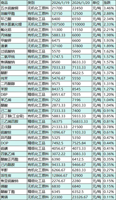 上涨品种整体呈现“温和复苏”基调,梯度分布清晰:五水硫酸铜以3.46%的涨幅领跑,油酸甲酯(2.88%)、环己酮(2.34%)、单水氢氧化锂(2.33%)构成2%-3.5%的中涨幅梯队;氟化铝(2.21%)、丙烯酸(1.98%)等6种品种涨幅在1.5%-2%区间;其余27种上涨品种涨幅均集中在0.11%-1.42%的窄幅区间,无极端暴涨品种。上涨动力源于“铜价成本传导+高端锂电需求韧性+部分化工品供应收缩+节前少量补库”的多元支撑,动能分散且稳健。