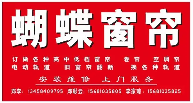 订做各种高中低档窗帘、旧窗帘翻新、卷帘、空调帘、电动轨道、换各种轨道、安装、维修、上门服务、服务周到。在蓬安打窗帘,当然就选蝴蝶窗帘! 选择蝴蝶窗帘,自然福气多多!地址: 蓬安县卫健局大门旁 电话: 13458409795 15681035825