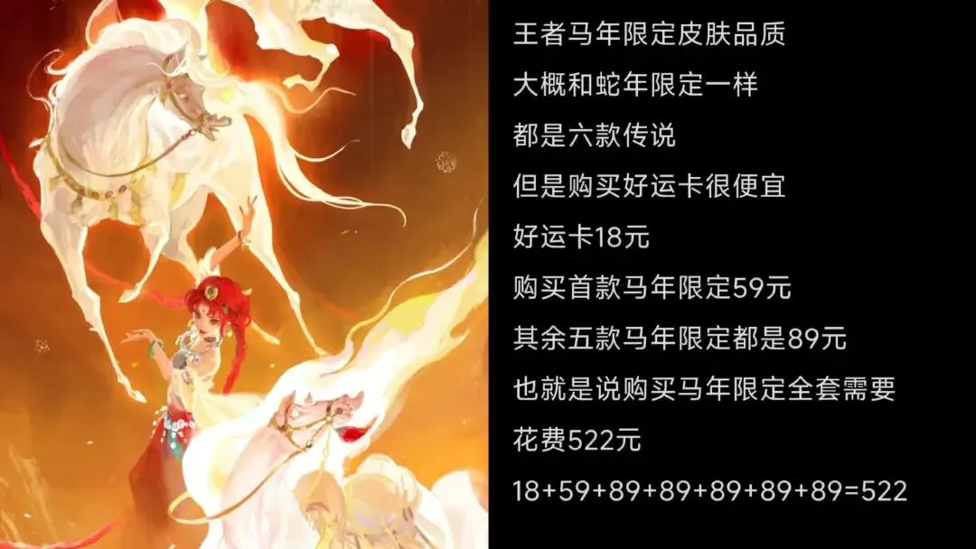 对于王者荣耀的小伙伴们,大家好呀!大家都知道现在距离春节已经只剩下20多天的时间了,在往年的这个时间段,关于年限皮肤可能已经被公布出来,人选、特效等一些信息。而今年除了人选之外,好像并没有公布其他的内容,很多的小伙伴对于今年的春节限定皮肤还是非常期待的,毕竟像这种春节限定皮肤质量一般都是比较高的,在目前王者荣耀上架的春节限定皮肤里面,就没有特别差的,而且价格也是非常的划算。那么今年马年限定皮肤到底会用什么样的配色、什么样的元素呢?