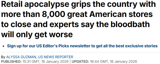 2026年伊始,美国零售业便笼罩在关店阴影之下。专家向《每日邮报》指出,在新年仅过去两周之际,已有知名零售商宣布关闭门店,而情况预计将进一步恶化。
