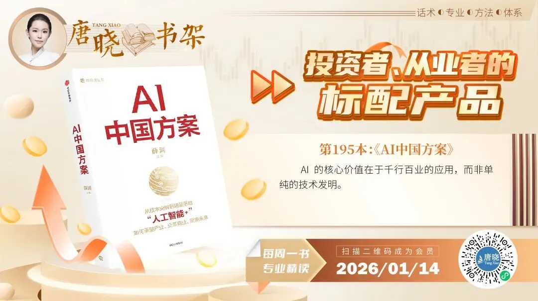 道理明明都懂,为什么就是做不到呢?假如现在你要给你的孩子留下些什么,供他余生使用。注意,是留给孩子的、不是给你自己的,只能三选一:好吧。下面接着看,如果现在给你20分钟时间可以自由利用,你会选择上面的哪个?多数人会选1和2~~~~注:凡“《唐晓书架》会员到期日在2026.12.31之后”,现均免费加入『唐晓书友』交流平台;纯公益,不承诺运营期限,这是《唐晓书架》会员的附赠品,不额外收费,但每年初须确保会员到期日不早于当年年末。下扫下图二维码,可成为会员。本周讲第195本书,《AI中国方案》。(直接在书架小程序给客服留言即可,客服会回复、指引加入『唐晓书友』)
