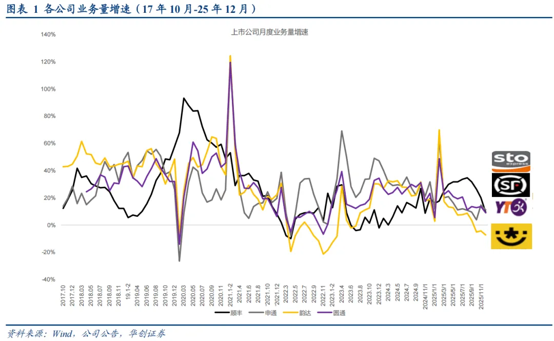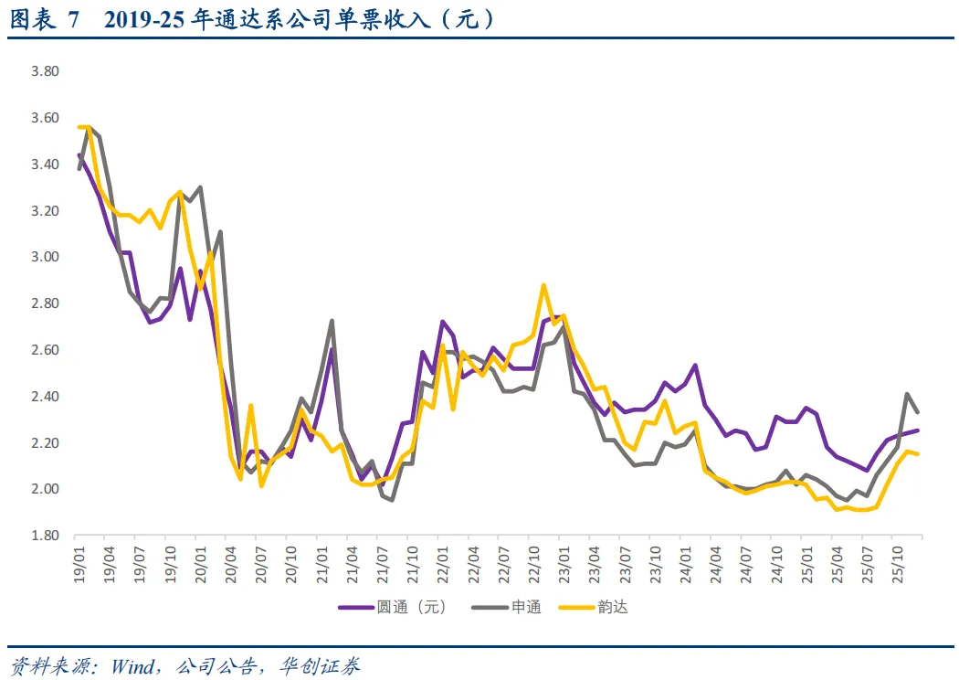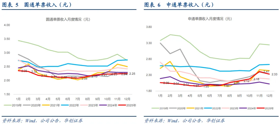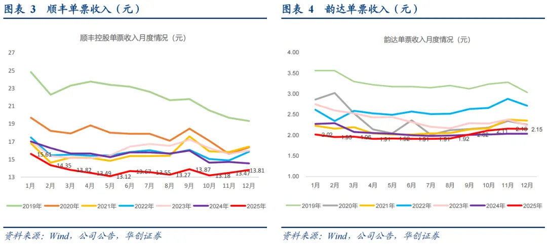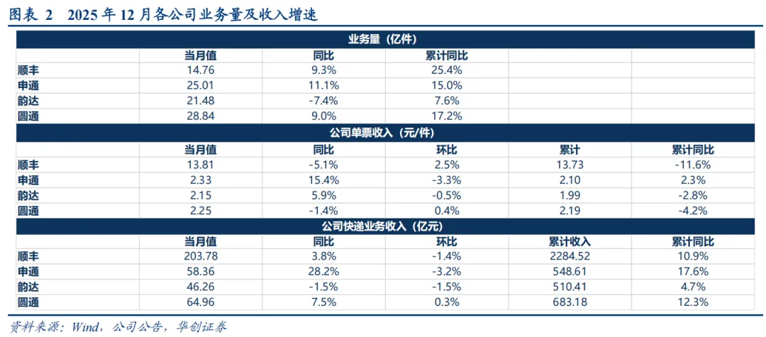 根据《证券期货投资者适当性管理办法》及配套指引,本资料仅面向华创证券客户中的金融机构专业投资者,请勿对本资料进行任何形式的转发。若您不是华创证券客户中的金融机构专业投资者,请勿订阅、接收或使用本资料中的信息。本资料难以设置访问权限,若给您造成不便,敬请谅解。感谢您的理解与配合。12月业务量同比增速:申通(11.1%)>顺丰(9.3%)>圆通(9.0%)>韵达(-7.4%)。1-12月业务量累计同比增速:顺丰(25.4%)>圆通(17.2%)>申通(15.0%)>韵达(7.6%)。(注:申通快递收购丹鸟物流及下属控股子公司,自2025年11月起丹鸟纳入公司的合并报表范围。)1)12月收入同比增速:申通(28.2%)>圆通(7.5%)>顺丰(3.8%)>韵达(-1.5%)。2)1-12月收入累计同比增速:申通(17.6%)>圆通(12.3%)>顺丰(10.9%)>韵达(4.7%)。申通2.33元,同比+15.4%(+0.31元),环比-3.3%(-0.08元),环比7月+18.3%;韵达2.15元,同比+5.9%(+0.12元),环比-0.5%(-0.01元),环比7月+12.6%;圆通2.25元,同比-1.4%(-0.04元),环比+0.4%(+0.01元),环比7月+8.2%;顺丰13.81元,同比-5.1%(-0.74元),环比+2.5%(+0.34元),环比7月+1.9%。2)12月单票收入较7月提升幅度分别为:圆通提升0.17元,韵达提升0.24元,申通0.36元(并表丹鸟影响)。8-12月从单票收入角度验证了行业提价逻辑。3)1-12月累计单票收入:申通2.10元,同比+2.3%(+0.05元);韵达1.99元,同比-2.8%(-0.06元);圆通2.19元,同比-4.2%(-0.10元);顺丰13.73元,同比-11.6%(-1.80元)。顺丰携手极兔,干线优势+末端能力融合,战略合作再升级。1月15日,顺丰控股与极兔速递联合公告战略交叉持股事项:顺丰拟通过境外全资附属公司认购极兔8.22亿股B类股份,发行价10.10港元/股,总对价82.99亿港元;本次交易之前,顺丰已持有极兔1.67%股份,交易完成后,顺丰将持有极兔10%股份。通过本次合作,双方将更好地利用顺丰跨境干线优势与极兔海外末端能力的优势进行互补,打造更高效、更具韧性的端到端履约体系,提升客户全链路体验。1、电商快递:继续推荐极兔海外行业高景气+“反内卷”龙头格局改善下中通、圆通投资机会。1)极兔速递:2025Q4东南亚日均件量同比+74%,新市场+80%;海外市场高增长,公司作为东南亚龙头及新市场重要参与者有望持续高成长。2)国内电商快递:行业件量增速放缓,各品牌分化显现,头部公司份额提升。推荐中通快递,龙头格局改善,估值低位、一旦弹性启动,性价比高。推荐圆通速递:核心指标追近龙头,且在行业增速放缓下依然持续领跑。2、持续看好顺丰投资机会,关注公司“增益计划”调优结构+携手极兔互补协同。1)总量看:“激活经营”机制有效推动公司业务规模扩张,亦有助于发挥网络规模效应,为长期降本增效助力。收入结构看:公司2025年三季报介绍,Q3中高端时效业务收入增速环比提升,服务客户规模持续扩大。2)2025年三季度业绩承压主要因公司采取积极主动的市场拓展策略与必要的长期战略投入所导致,我们认为属于短期波动。关注公司“增益计划”调优结构。3)携手极兔,互补协同,未来可期。我们继续强调从自由现金流维度看顺丰:我们认为可持续优化。风险提示:经济出现下滑,行业业务量增速明显放缓,价格战明显扩大。投资建议等具体内容详见华创证券研究所2026年1月20日发布的报告《快递行业12月数据点评:12月行业增速放缓,品牌增速分化显现;顺丰增速放缓,关注公司“增益计划”调优结构》法律声明: