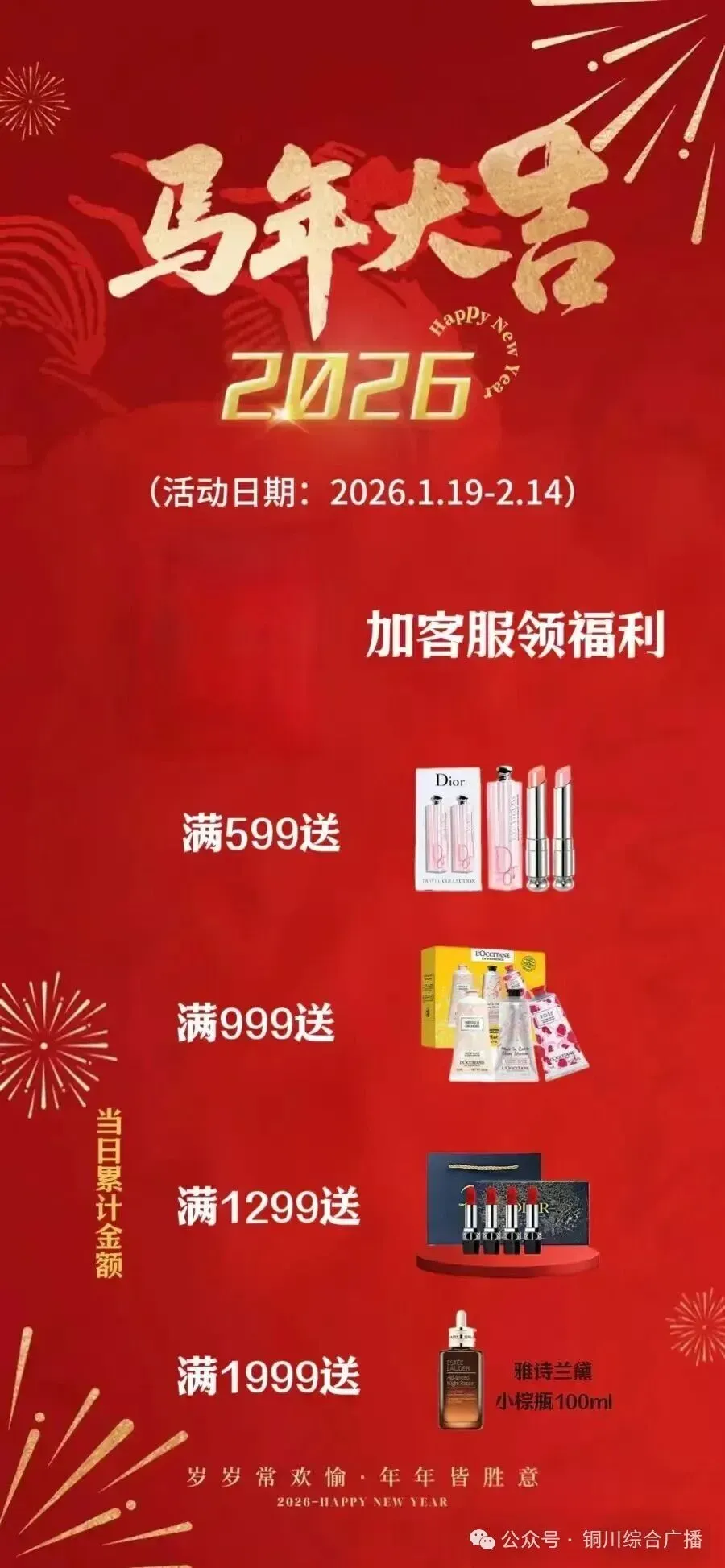 注意了!手头的事先放一放!耳朵竖起来!好物研究所年度最狂年货节——它终于来了!这次不是套路,不是门槛,是实实在在的满额就送!全商城所有产品参与!现在下单,只要消费满599元——直接送你迪奥魅惑唇膏! 满999元——送欧舒丹明星护手霜;重磅在这里,满1299元——直接抱走迪奥口红套盒!但真正的王炸——是满1999元!直接送雅诗兰黛小棕瓶100毫升正装! 修护抗老,一瓶到位!平时一瓶都要四位数,今天满额直接带走!心动的一定要微信搜搜索“铜川综合广播”回复“4”提前加购预定这份新年福利!
