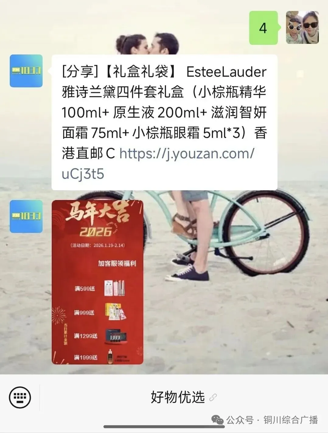 算一笔账:光是今天这个699元的雅诗兰黛四件套礼盒,就已经物超所值。如果你想冲刺满赠,无论是为家人再添一份心意,还是和朋友拼单,都能轻松达到门槛,把迪奥、欧舒丹这些大牌赠品抱回家!尤其是冲到1999元,多得一支100ml小棕瓶正装,这机会简直可遇不可求!微信赶快搜索“铜川综合广播”回复“4”解锁这份新年第一份好礼吧!