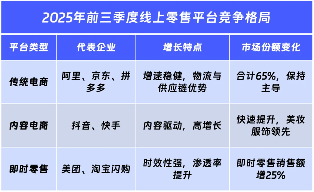 2025年,线上零售延续稳健增长态势,呈现出传统电商与内容电商互补共生的格局。前三季度实物网上零售额同比增长9.8%,增速同比提升1.9个百分点。阿里、京东、拼多多三大传统电商平台合计市场份额达65%,继续保持主导地位。新兴平台的爆发成为最大亮点。抖音电商和快手电商凭借内容生态与直播带货深度融合,实现跨越式增长。2025年618大促期间,抖音电商渗透率较日常提升4.1个百分点,服饰、美妆品类市占率均超20%。技术创新赋能明显,个性化推荐系统使用率达85%,AR技术渗透率达15%,智能仓储自动化率超过90%。