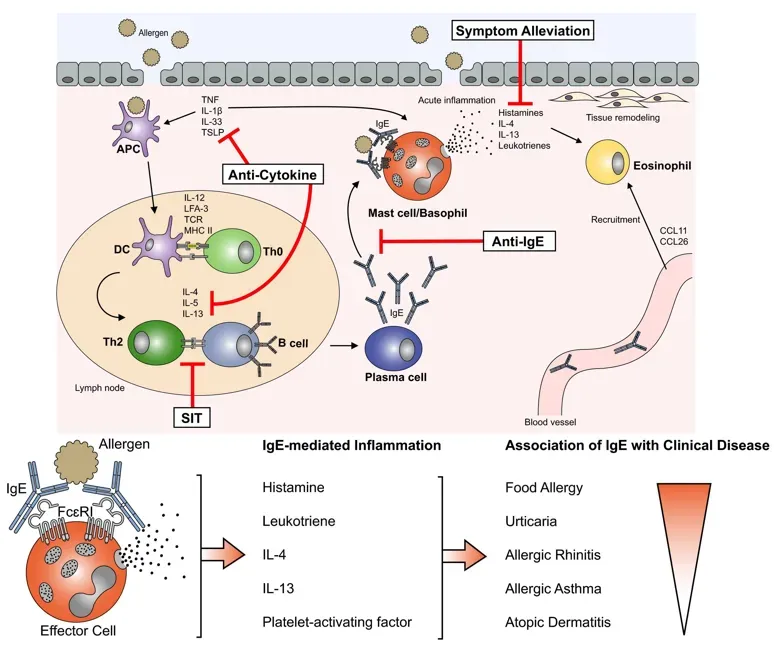 要理解药物研发的逻辑,必须先看懂过敏反应的微观战场。过敏并非单一症状,而是一场由多细胞、多因子参与的级联反应。