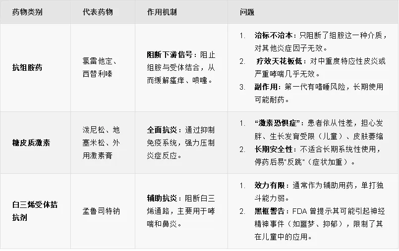 在过去的几十年里,过敏治疗主要依赖“老三样”:抗组胺药、糖皮质激素、白三烯受体拮抗剂。虽然它们是基础用药,但在面对中重度、复杂性过敏时,局限性日益凸显。