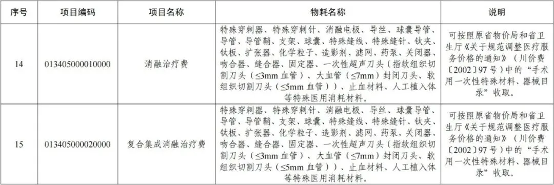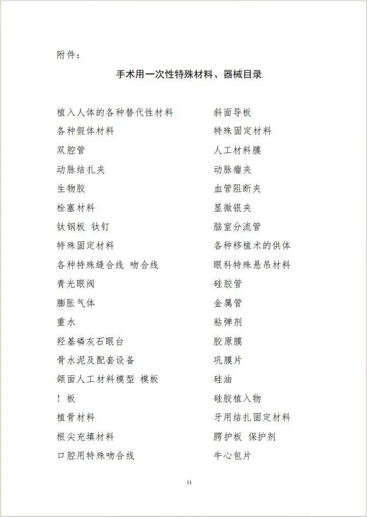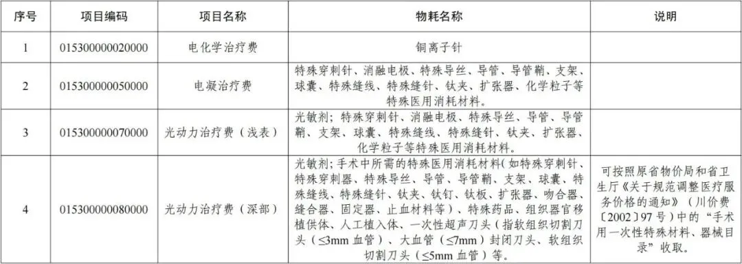 列入本清单的物耗,可向患者另外收费,价格标准按照实际采购价格零差率销售;其他物耗已包含在医疗服务项目中,一律不得另外收费。原省物价局和省卫生厅《关于规范调整医疗服务价格的通知》(川价费〔2002〕97 号)中的“手术用一次性特殊材料、器械目录”继续执行,目录见文末。