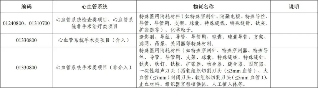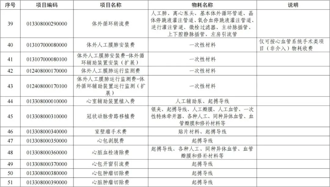 列入本清单的物耗,可向患者另外收费,价格标准按照实际采购价格零差率销售;其他物耗已包含在医疗服务项目中,一律不得另外收费。心血管系统手术类项目(非介入)可按原省物价局和省卫生厅《关于规范调整医疗服务价格的通知》(川价费〔2002〕97 号)中的“手术用一次性特殊材料、器械目录”继续执行,目录见文末。