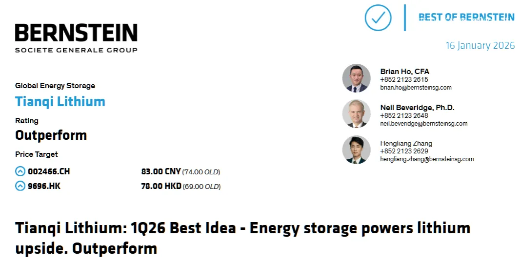 伯恩斯坦维持天齐锂业 “跑赢大盘” 评级,大幅上调目标价 ——A 股从 74 元上调至 83 元,H 股从 69 港元上调至 78 港元,截至 2026 年 1 月 14 日,A 股收盘价 59.82 元,隐含 39% 的上涨空间。