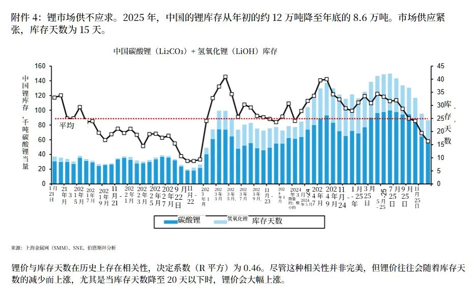 库存数据印证市场收紧:2025 年中国锂库存从年初的 12 万吨降至年末的 8.6 万吨,库存天数从 30-35 天骤降至 15 天,市场紧张程度较上年翻倍。历史数据显示,当库存天数低于 20 天时,锂价往往会大幅上涨,当前库存水平已触发涨价预警。此外,2026 年全球锂产能增速预计仅 17%,远低于需求 29% 的增速,供需缺口将进一步拉大。