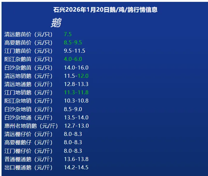 江门鹅苗9.5-11.5(元/只)棚仔48-50天8.1-8.4(元/斤)地销70-80天11.7-12.2(元/斤)地通90-100天13-13.5(元/斤)棚通90-100天13.5-13.8(元/斤)
