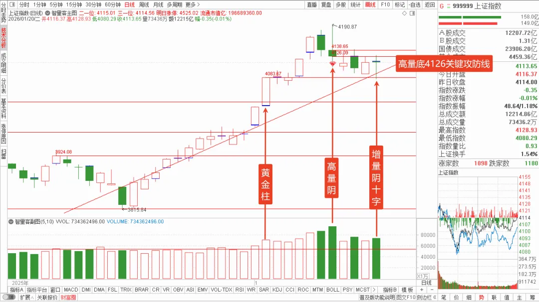 明日三线:次日大盘三线可设为4102(前日阳二一位)-4113(今日收盘位)- 4126(高量阴实底)