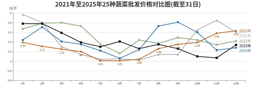 2025年蔬菜批发、社区菜店、连锁超市价格分别为每斤1.29元、3.28元、3.88元,同比分别下降9.15%、5.48%、1.77%。
