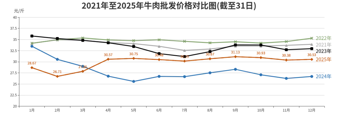 2025年牛肉批发、农贸、超市价格分别为每斤29.9元、33.27元、40.04元,同比分别上涨7.25%、下降3.34%、下降0.99%。