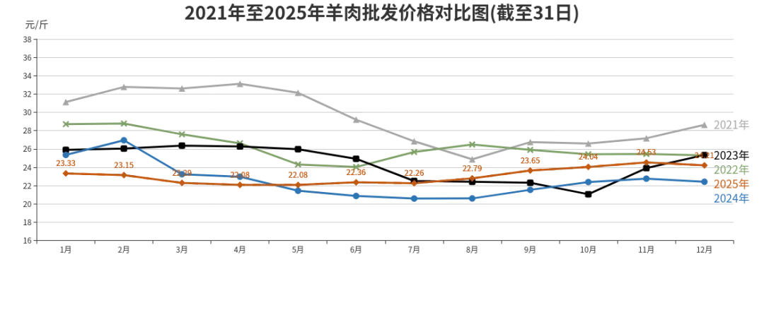 2025年羊肉批发、农贸、超市价格分别为每斤23.06元、35.98元、43元,同比分别为上涨2.08%、下降2.12%、下降1.49%。