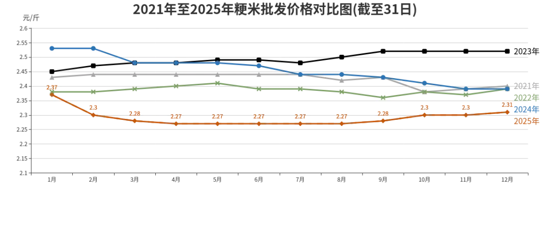 2025年粳米批发、农贸、超市价格分别为每斤2.29元、3.11元、2.89元,同比分别为下降6.91%、上涨1.3%、下降1.37%。