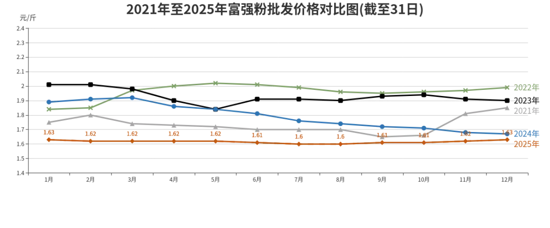 2025年富强粉批发、农贸、超市价格分别为每斤1.62元、2.26元、2.27元,同比分别为下降9.5%、下降2.16%、下降5.02%。