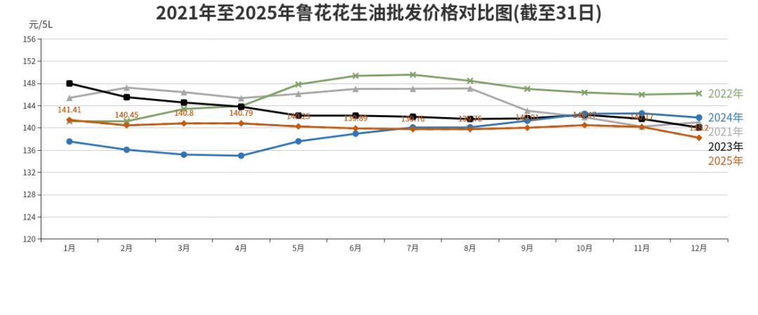 2025年“鲁花”花生油批发、农贸、超市价格分别为每5升140.16元、150.31元、160.93元,同比分别上涨0.8%、下降0.06%、上涨1.15%。