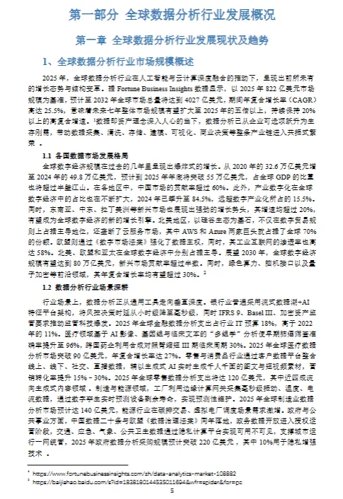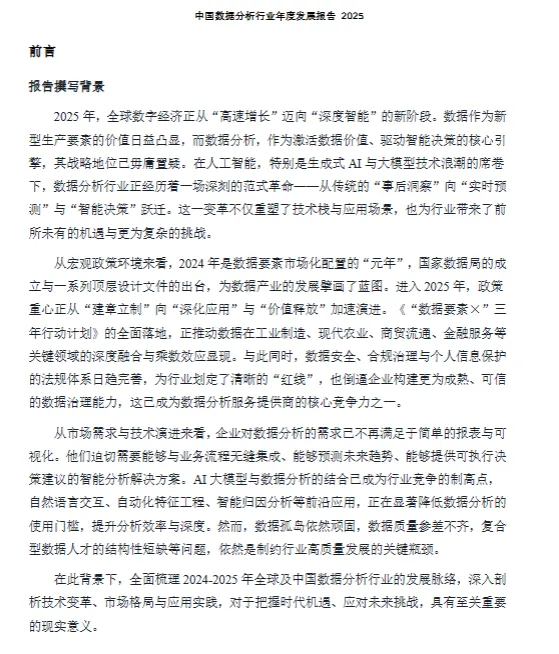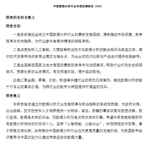 中国商业联合会《中国数据分析行业年度发展报告 2025》核心结论:行业已进入 “AI 融合 + 场景深耕” 的高质量发展阶段,2025 年全球市场规模达 822 亿美元,中国数据产业规模超 5.86 万亿元,大模型与数据分析深度融合推动从 “事后洞察” 向 “实时决策” 转型,金融、零售、农牧、教育等领域场景化应用成为增长核心。