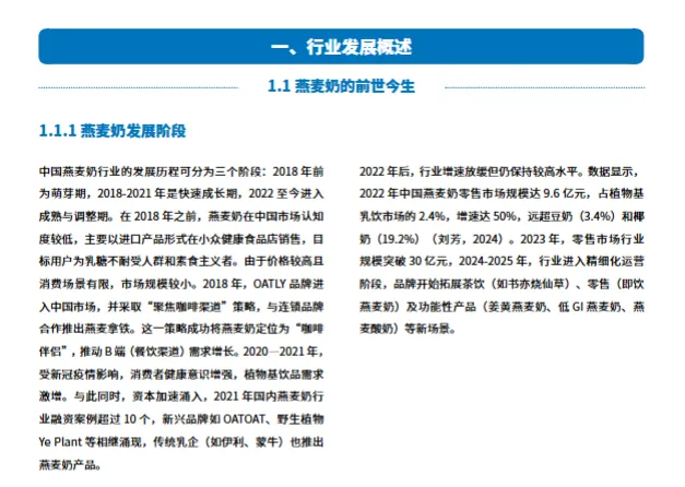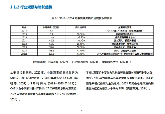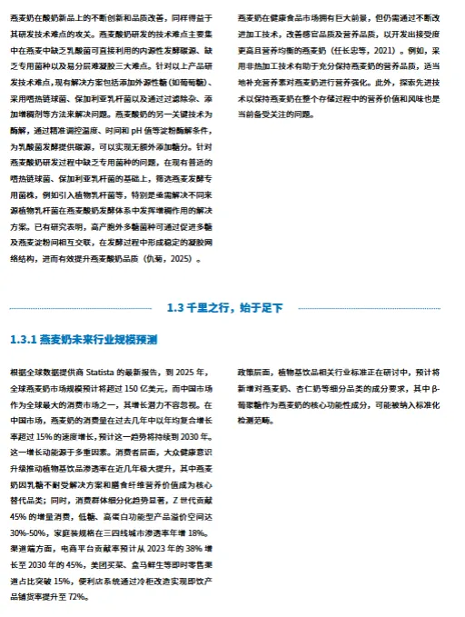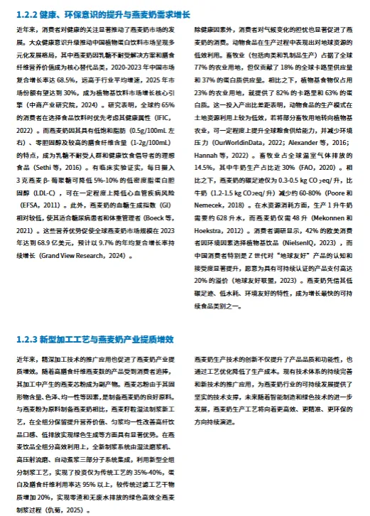 农业农村部《2025 中国燕麦奶行业白皮书》核心结论:燕麦奶行业已从品类扩张迈入 “全面功能化创新” 新阶段,健康属性(富含 β- 葡聚糖、无乳糖)与低碳环保特性形成核心竞争力,2025 年市场规模预计达 209.8 亿元,功能细分、场景深耕与可持续发展成为行业高质量发展的关键方向。