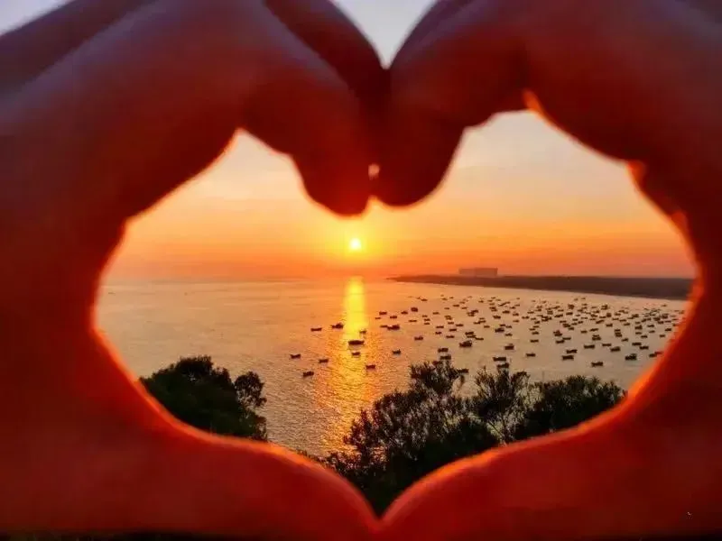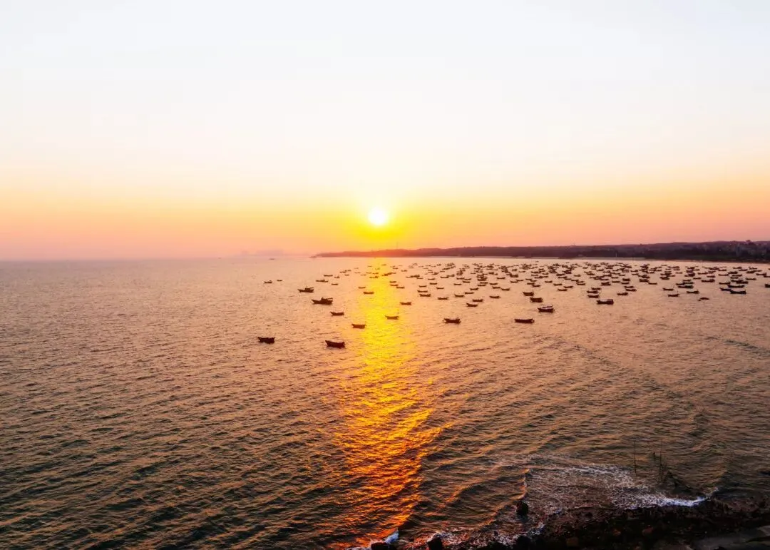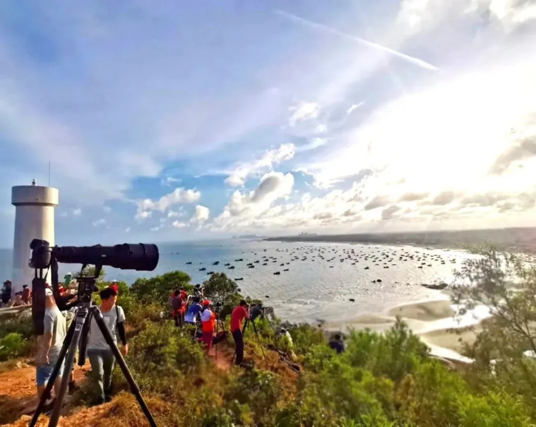 傍晚时分,看平静的海平面余波把夕阳映成碎片,千帆归来、渔船回港。这是晏镜岭独有的景观。
