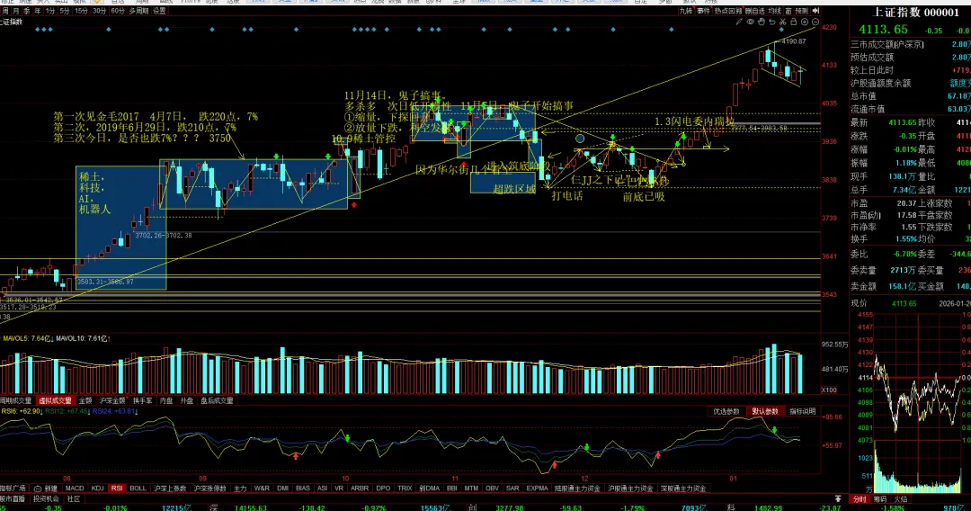 今日沪指跌0.01%,深成指跌0.97%,创业板指跌1.79%,两市成交额2.78万亿,较上一个交易日放量694亿。盘面上,全市场超3100只个股下跌,三大指数集体收跌,创业板指一度跌超2%。技术面上,今日上证指数下探回升,成交量略微放量,市场存在弹性,但是情绪依旧未完全回暖,调整还在继续,整体是一个窄幅的下行通道。消息面上,开年以来,Y行、CZ部等推出一系列的政策大礼包,助力经济发展,惠及百姓生活。财政部官网今日连续发布5个文件,涉及个人消费贷、民间投资等领域。Y行1月15日出台8项政策举措,支持经济结构转型优化。综上,没啥好说的,继续静待调整完成。说真的还不如一步到位下到4050之下去,然后筑底,再放量反攻,这样磨磨唧唧不知道到啥时候。可能是想等MA20主动上移到K线,也是一种可能性。