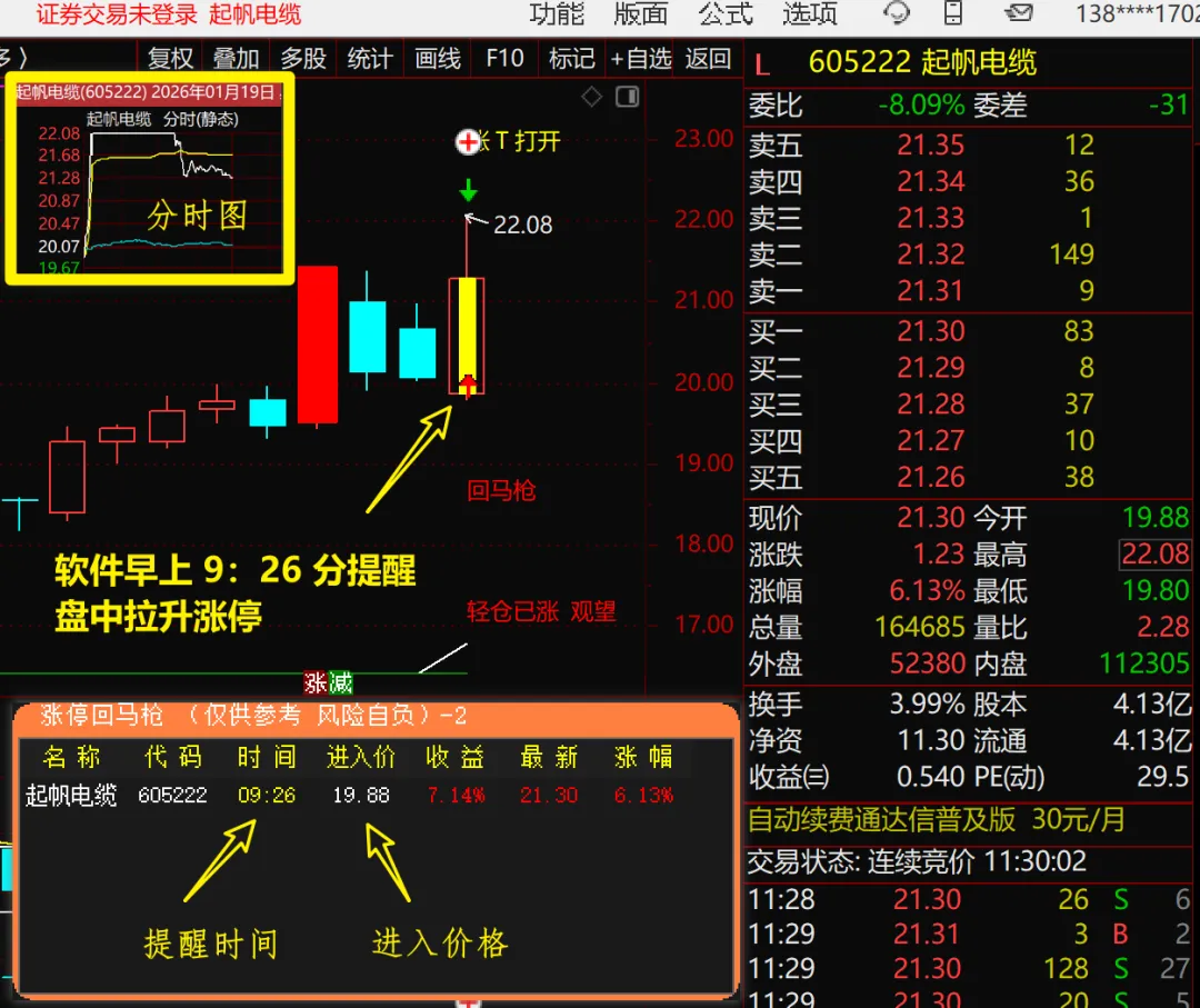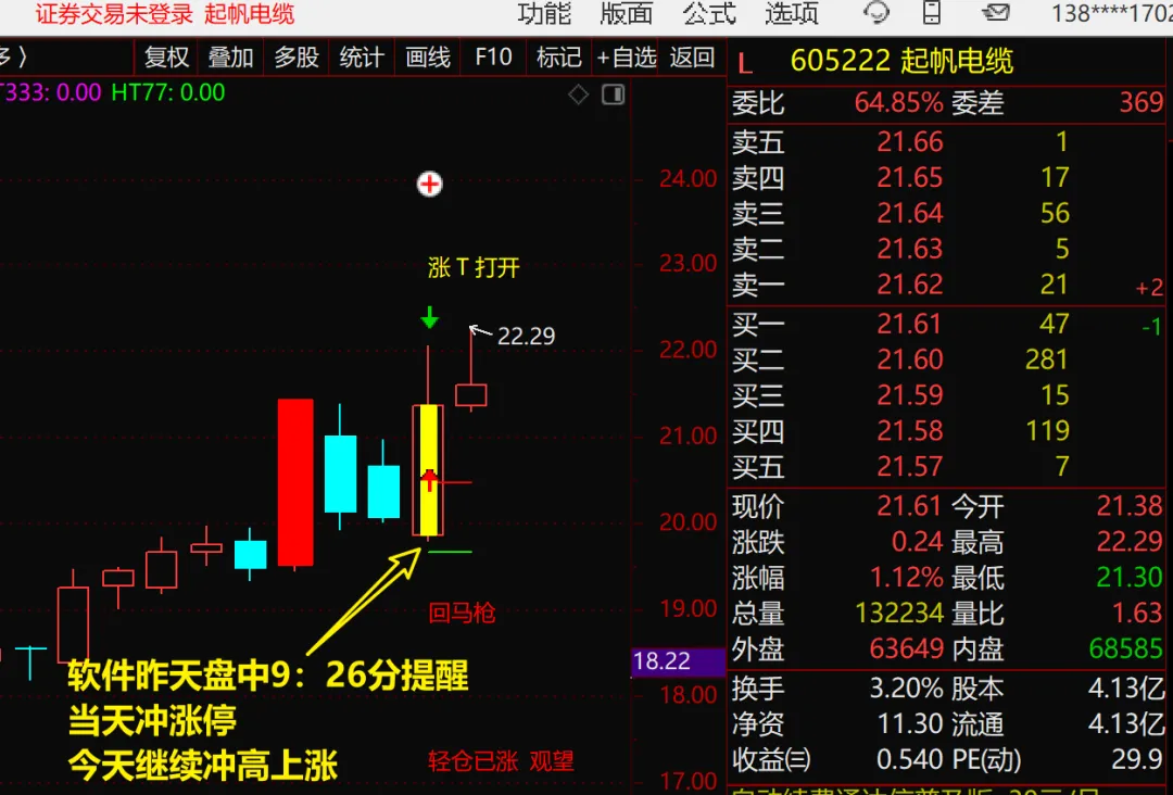 软件今天在上午 9点26分提醒,开盘后涨停(上图为电脑显示效果)