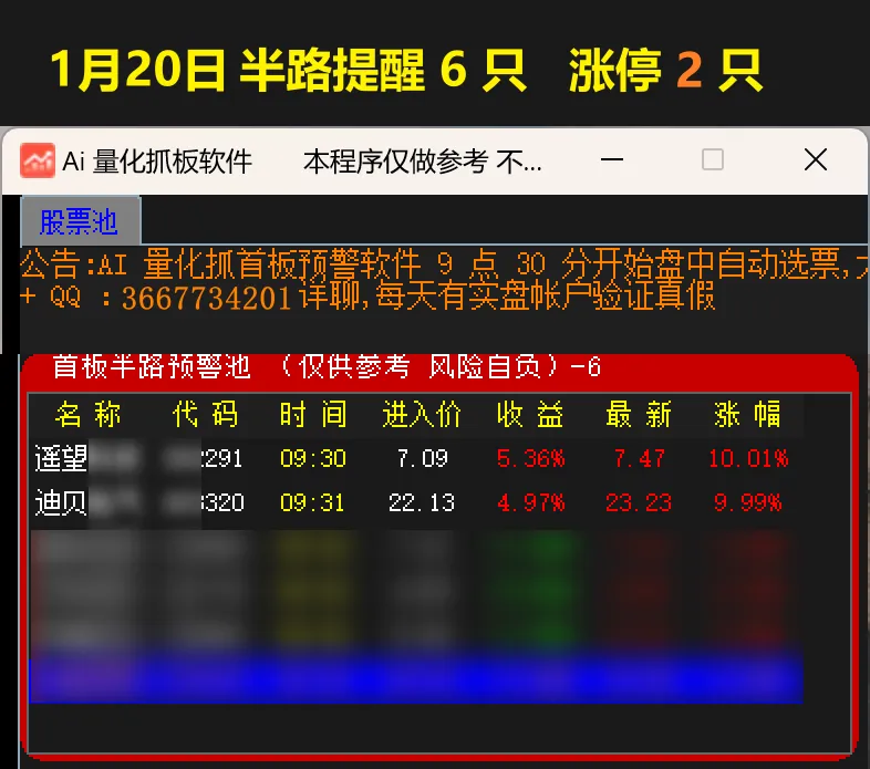 市场有风险,投资需谨慎。本文章展示AI量化软件预警界面,记录程序化自动抓板和短线回马枪战法所用,投资者应保持独立思考,不要盲目跟风,唯有自渡