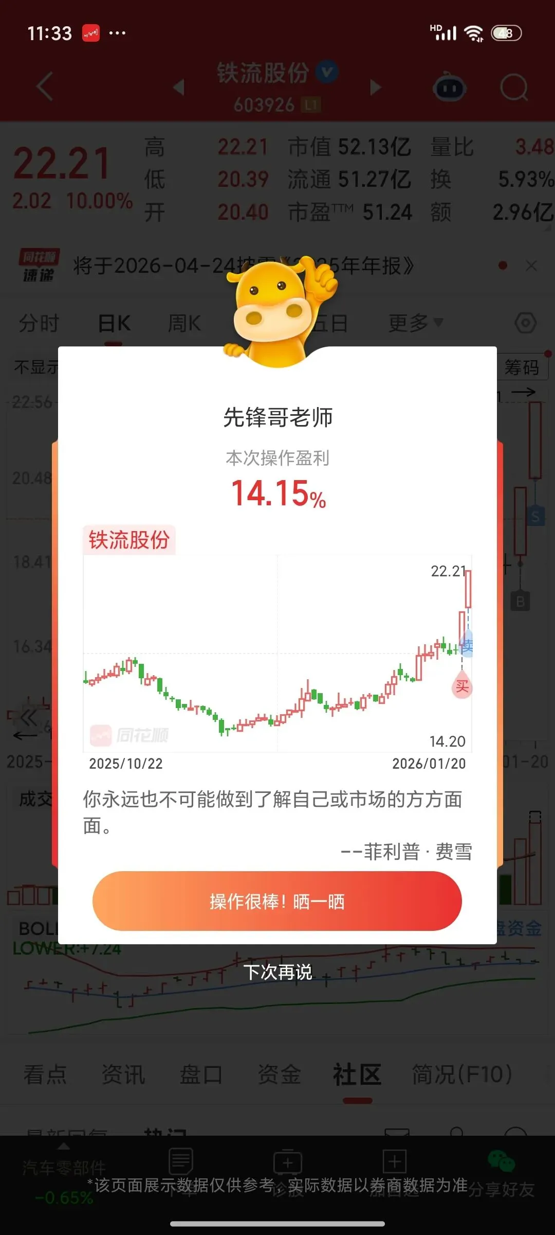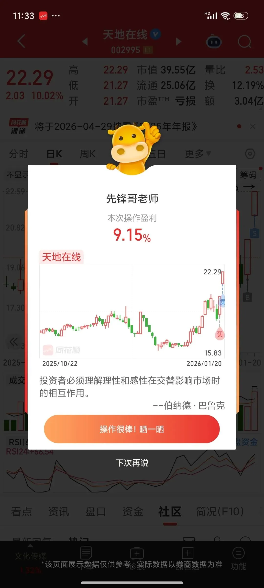 半路上车成功率不会太高,成功一只能大赚!这就是广撒网的好处,东边不亮西边亮,当然这也是短线抓板的快乐,你抓的板越多,遇到一字板的概率就越大,坚持的结果!有的标的当天失败,也不意味就一定会是亏损,第二天也有机会,它就算失败亏损也不大,这就是为什么成功一只,可以弥补好几只失败的原因,你能做到30%的成功率,可以稳定获利了!