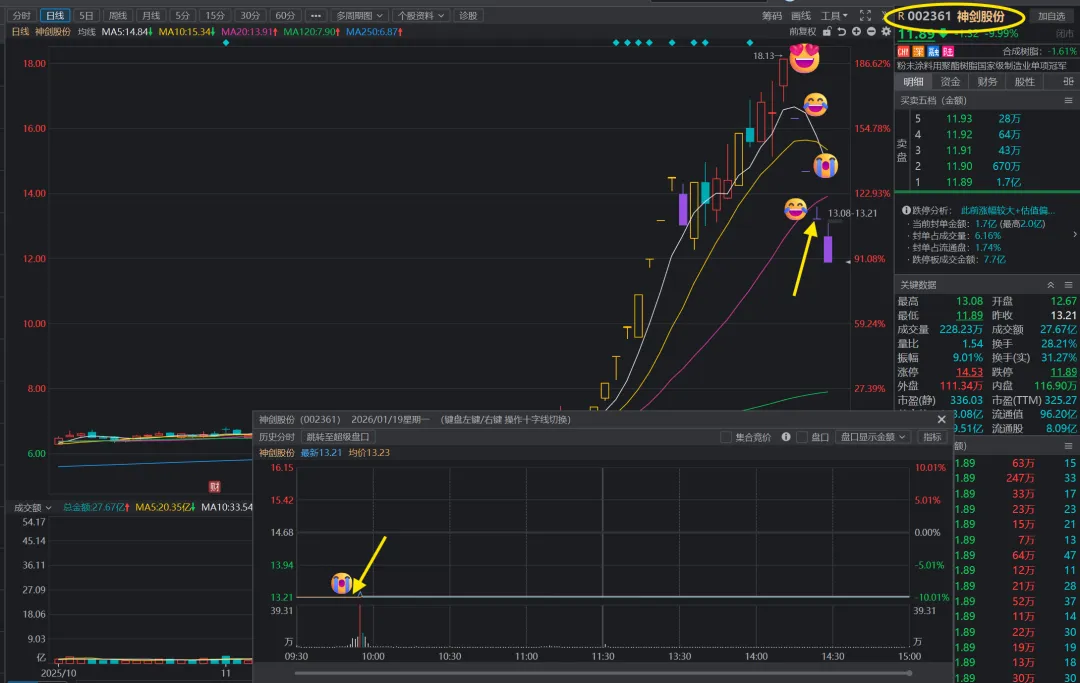 神剑股份:我在几乎最高位买入,吃了3个跌停,在箭头处出来了,一身轻松,长记性了。