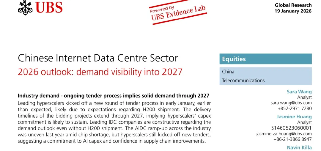 报告出品:Goldman Research Sachs:Chinese Internet Data Centre Sector2026 outlook:demand visibility into 202701
