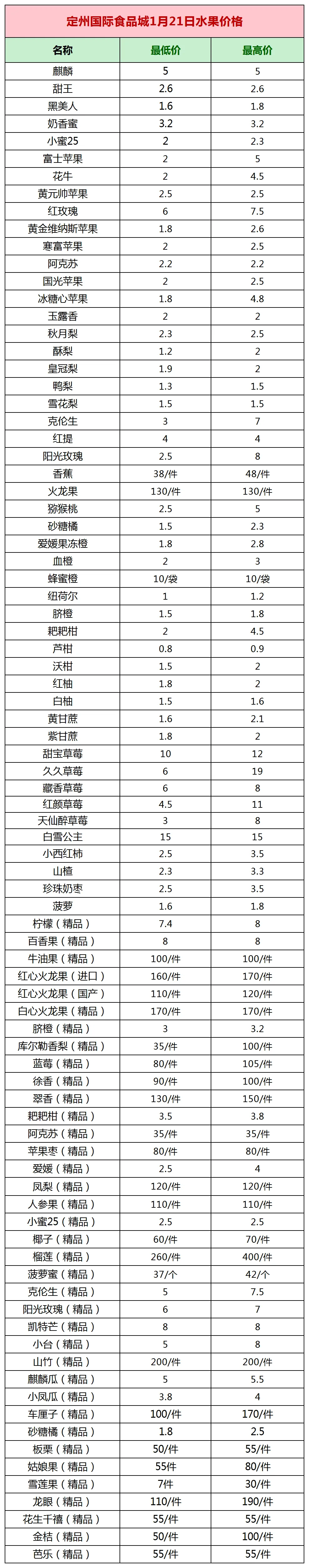 【民以食为天,365天,天天无淡季。为方便广大商户进货采买,获取最新蔬果信息,此微信号每日为您提供定州国际食品城蔬果行情。以下果蔬价格数据计量单位均为元/斤!果蔬价格行情波动比较频繁,请以实际购买单价为准!】