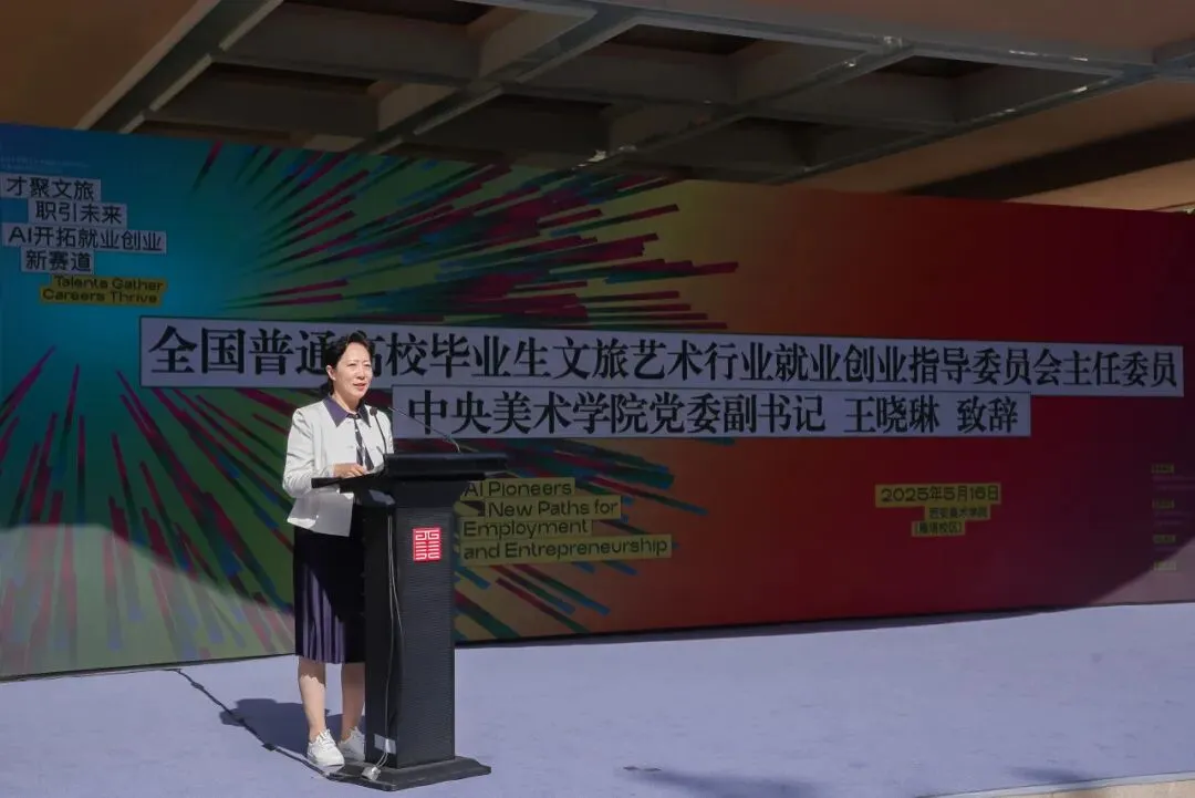 全国文旅艺就指委主任委员、中央美术学院党委副书记王晓琳在致辞中强调要持续开拓“AI+文旅”新兴就业赛道,搭建“数字就业服务矩阵”,打造“数字技能培训体系”,以数字赋能助力毕业生高质量就业。