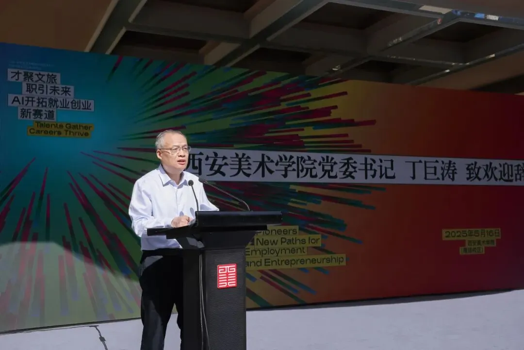 西安美术学院党委书记丁巨涛在致辞中对各位嘉宾的到来表示热烈欢迎,他指出,本次系列活动紧扣数字技术与文旅艺术融合主题,共同探讨文旅艺术行业就业创业的新趋势、新机遇与新挑战,为毕业生提供更多就业创业机会,为全国文旅艺术行业的专家学者、高校师生以及企业代表提供交流合作的平台,共同推动文旅艺术行业与数字技术的深度融合与创新发展。