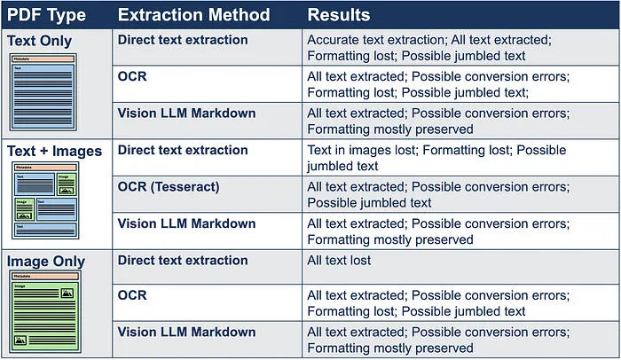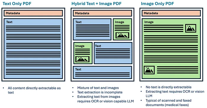 文档处理系统需要处理的三种基本类型的 PDF:纯文本 PDF(所有内容可以直接提取)、混合 PDF(信息包含在文本和图像的混合中)、以及 纯图像 PDF(所有内容都包含在图像中)。下图显示了这些类型及其提取特征: