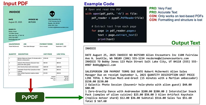 对于简单的纯文本 PDF,提取内容是直接了当的,出错的机会很小,因为文本是直接复制的。缺点是这种方法只适用于纯文本 PDF,格式如布局和表格会丢失。结果,输出可能变成一团文本,当存在列或表格时,内容可能会被错误排序。下面的示例展示了使用 Python 的 PyPDF 包进行直接文本提取: