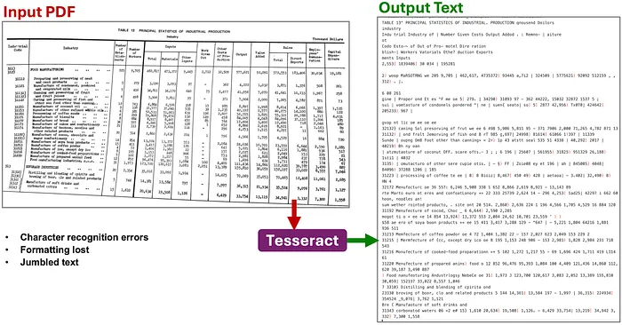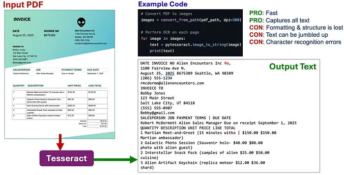 我们将研究的下一个方法是光学字符识别(OCR)。对于混合 PDF(文本和图像的混合)和纯图像 PDF,OCR 可以用来提取文本内容。这种方法与直接文本提取有一些相同的限制。格式如布局和表格会丢失,文本可能会被错误排序,但 OCR 还会引入字符识别错误,尤其是当图像或扫描质量较低时。在这个示例中,我们将使用 Tesseract 和 pdf2image Python 包。