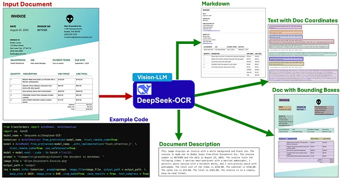 DeepSeek-OCR 名称中的"OCR"有点名不副实。它不像 Tesseract 那样使用传统的 OCR 方法。相反,它使用具有令人印象深刻提取能力的具有视觉能力的大语言模型: