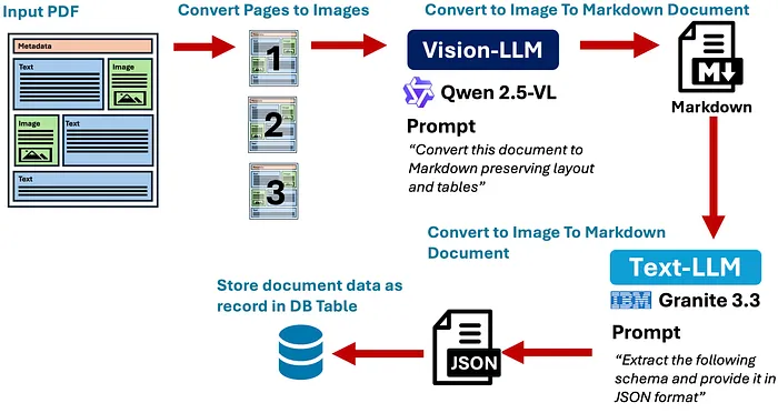 下图显示了视觉大语言模型驱动管道的高级概念。简而言之,文档被转换为一堆图像(每页一个图像)。然后这些图像被传递给具有视觉能力的大语言模型,它将文档转换为 Markdown。然后 Markdown 被输入到一个带有特定任务提取指令的纯文本大语言模型中,返回一个存储在数据库中的 JSON 文档: