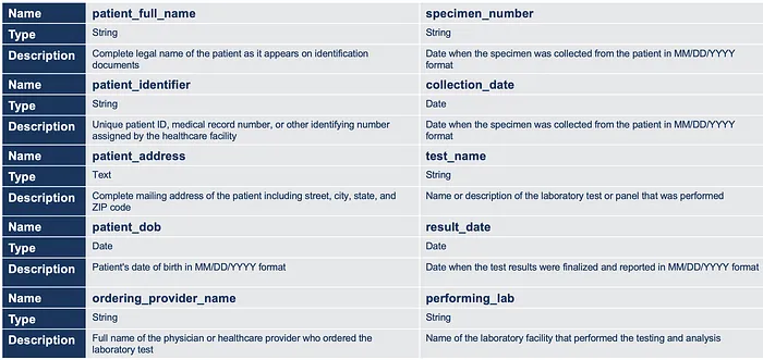 在与主题专家合作定义了应该从外部医疗结果文档中捕获哪些数据之后,我们为管道的数据提取阶段创建了以下模式: