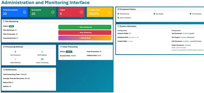 概念验证系统包括一个基本的管理用户界面,可用于监控指标、健康状况和配置,以及启动、停止或手动触发文档摄入目录扫描的控件: