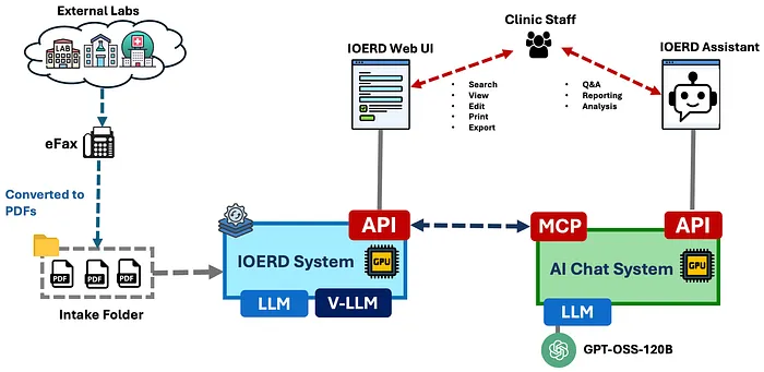 下面是为处理外部医疗结果文档而构建的概念验证系统的高级 diagram。该系统的直接文本提取和 OCR 提取功能首先实现,如果需要仍然可以使用,但视觉大语言模型提取被配置为默认方法: