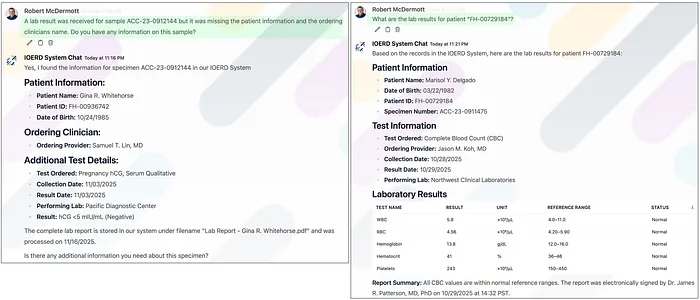使用上面显示的 API,我们构建了一个智能体助手,允许用户询问关于文档、患者特定结果或系统可以回答的任何其他问题。智能体助手使用 API 检索相关信息并回复用户。