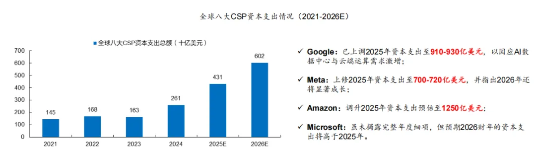 CSP持续上修资本开支指引。预计2025年全球八大CSP资本开支总额将达4310亿美元,同比增长65%,较先前预期的61%的同比增速上修约4 pct。预计2026年,全球八大CSP资本开支总额将进一步提升至6020亿美元。