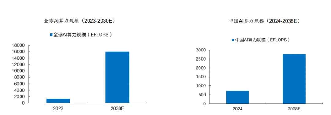 人工智能进入算力新时代,全球算力规模高速增长。根据 IDC、Gartner、TOP500、中国信通院的预测,预计全球算力规模将从 2023 年的 1397 EFLOPS 增长至 2030 年的 16 ZFLOPS,预计2023-2030 年全球算力规模复合增速达 50%。根据 IDC 的数据,2024 年中国智能算力规模为725.3 EFLOPS,预计 2028 年将达到 2781.9 EFLOPS,预计 2024-2028年中国智能算力规模的复合增速为 46.2%。