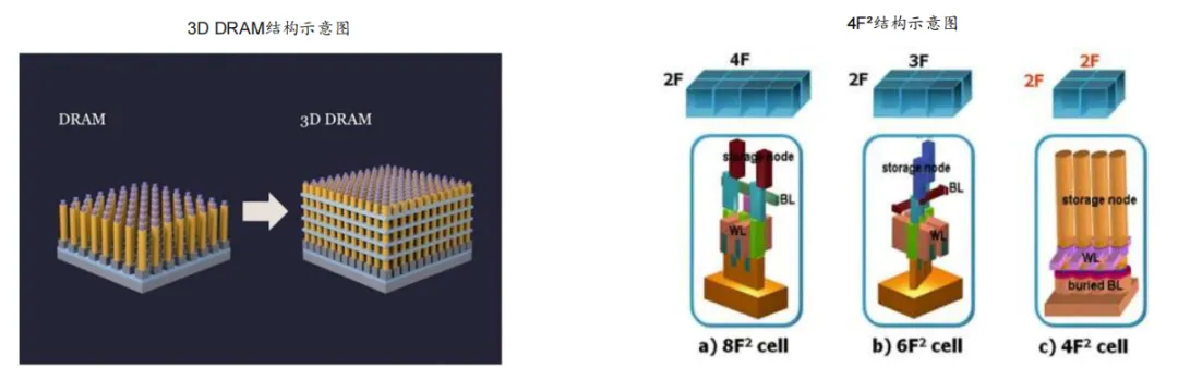 4F²是一种DRAM存储单元的极限面积表示法,指每个位单元仅占2F×2F的面积,通过把源极、栅极、漏极由水平排布改为垂直堆叠来实现,比传统6F²节省约30%芯片面积。4F²的垂直单元结构正是3D DRAM的核心构建方式,它是平面DRAM向垂直化发展的关键技术,被视为水平微缩走到极限后的突破口 。