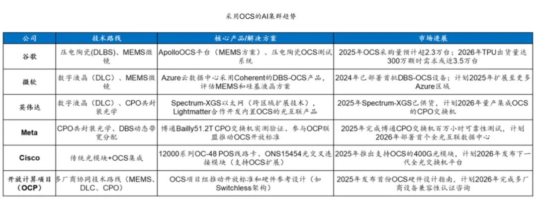 光交换机(Optical Circuit Switch, OCS)指的是基于全光信号的交换机设备,其工作原理是通过配置光交换矩阵,从而在任意输入和输出端口间建立光学路径以实现信号的交换。相较于电交换机,OCS无需光电信号转换和相应的数据包处理过程,可显著降低时延和功耗,系统故障概率也有所降低,且OCS无需进行端口速率的频繁迭代,通过单纯的光路重定向即可实现跨代设备的无缝互联,可大幅提高硬件使用寿命。